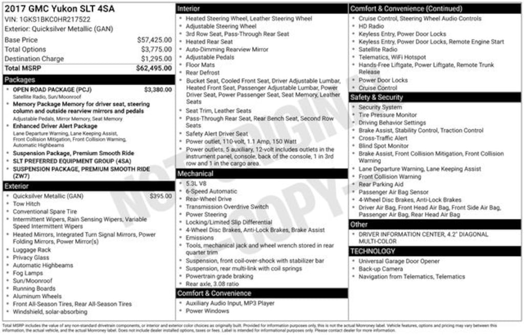 Yukon SLT, 4D Sport Utility, 6-Speed Automatic Electronic with Overdrive, RWD, Quicksilver Metallic, Jet Black Leather, 17" Disc/Disc VAC Power Brakes, 3.08 Rear Axle Ratio, 3rd row seats: split-bench, 4-Wheel Disc Brakes, 5 Auxiliary 12-volt Power Outlets, 9 Speakers, ABS brakes, Adjustable pedals, Air Conditioning, Alloy wheels, AM/FM radio: SiriusXM, Apple CarPlay/Android Auto, Auto High-beam Headlights, Auto-dimming door mirrors, Auto-dimming Rear-View mirror, Automatic temperature control, Black Assist Steps w/Chrome Strip, Bose Premium 9-Speaker System, Brake assist, Bumpers: body-color, CD Player, CD player, Compass, Delay-off headlights, Driver door bin, Driver vanity mirror, Dual front impact airbags, Dual front side impact airbags, Electronic Stability Control, Emergency communication system: OnStar Guidance, Enhanced Driver Alert Package, Exterior Parking Camera Rear, Forward Collision Alert Sensor Indicator, Front anti-roll bar, Front Bucket Seats, Front Center Armrest, Front dual zone A/C, Front fog lights, Front reading lights, Front wheel independent suspension, Full-Feature Reclining Bucket Seats, Fully automatic headlights, Garage door transmitter, Hands Free Power Liftgate, Heated & Ventilated Driver & Front Passenger Seats, Heated door mirrors, Heated front seats, Heated Leather-Wrapped Steering Wheel, Heated rear seats, Heated steering wheel, Illuminated entry, Inside Rear-View Auto-Dimming Mirror, Intellibeam Automatic High Beam On/Off Headlamps, Lane Keep Assist, Low Speed Forward Automatic Braking, Low tire pressure warning, Memory Package, Memory seat, NavTraffic, Occupant sensing airbag, OnStar Basic Plan For 5 Years, OnStar w/4G LTE, Open Road Package, Outside temperature display, Overhead airbag, Overhead console, Panic alarm, Passenger door bin, Passenger vanity mirror, Passive Entry System, Pedal memory, Perforated Leather-Appointed Seat Trim, Power door mirrors, Power driver seat, Power Liftgate, Power passenger seat, Power Release 2nd Row 60/40 Split-Folding Bench Seat, Power steering, Power Tilt & Telescopic Steering Column, Power Tilt-Sliding Sunroof w/Express-Open/Close, Power windows, Power-Adjustable Pedals For Accelerator & Brake, Preferred Equipment Group 4SA, Premium audio system: IntelliLink, Premium Smooth Ride Suspension Package, Push Button Keyless Start, Radio: AM/FM/SiriusXM, Radio: AM/FM/SiriusXM w/Navigation, Rain sensing wipers, Rear air conditioning, Rear anti-roll bar, Rear Cross-Traffic Alert, Rear reading lights, Rear Seat Blu-Ray/DVD Entertainment System, Rear seat center armrest, Rear window defroster, Rear window wiper, Remote Keyless Entry, Remote keyless entry, Roof rack: rails only, Security system, Side Blind Zone Alert w/Lane Change Alert, SiriusXM Satellite Radio, Speed control, Speed-sensing steering, Split folding rear seat, Spoiler, Steering wheel memory, Steering wheel mounted audio controls, Tachometer, Telescoping steering wheel, Tilt steering wheel, Traction control, Trip computer, Turn signal indicator mirrors, Universal Home Remote, Variably intermittent wipers, Ventilated front seats, Voltmeter, Wheels: 18" x 8.5" Bright Machined Aluminum, Wireless Charging. Clean CARFAX. Quicksilver Metallic 2017 GMC Yukon SLT RWD 6-Speed Automatic Electronic with Overdrive EcoTec3 5.3L V8
