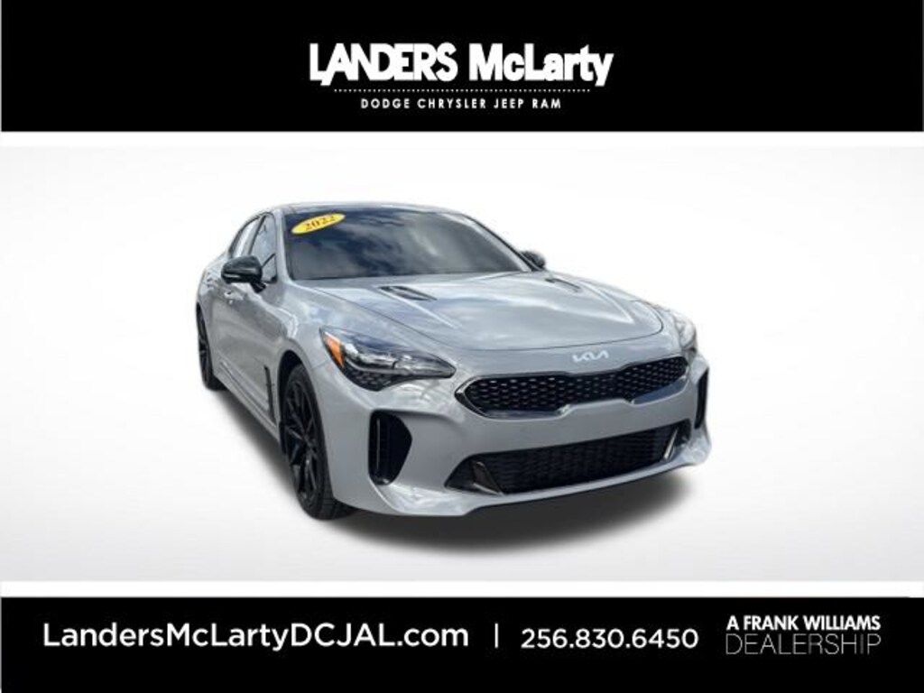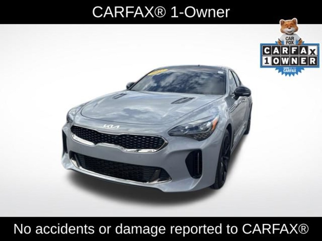 Stinger GT2, 4D Sedan, 3.3L V6 DGI, 8-Speed Automatic, AWD, Ceramic Silver, Black Leather, 15 Speakers, 4-Wheel Disc Brakes, ABS brakes, Adaptive suspension, Air Conditioning, Alloy wheels, AM/FM radio: SiriusXM, Anti-whiplash front head restraints, Apple CarPlay & Android Auto, Auto High-beam Headlights, Auto tilt-away steering wheel, Auto-dimming door mirrors, Auto-dimming Rear-View mirror, Automatic temperature control, Black Fender Garnish, Black Side Rearview Mirror Caps, Body Color Rear Spoiler, Brake assist, Bumpers: body-color, Carbon Fiber Patterned Interior Trim, Compass, Dark Finish Exhaust Tips, Delay-off headlights, Driver door bin, Driver vanity mirror, Dual front impact airbags, Dual front side impact airbags, Electronic Stability Control, Emergency communication system: UVO eServices, Four wheel independent suspension, Front anti-roll bar, Front Bucket Seats, Front Center Armrest, Front dual zone A/C, Front reading lights, Fully automatic headlights, Garage door transmitter: HomeLink, harman/kardon® Speakers, Heads-Up Display, Heated & Ventilated Front Bucket Seats, Heated door mirrors, Heated front seats, Heated rear seats, Heated steering wheel, Illuminated entry, Knee airbag, Low tire pressure warning, Memory seat, Nappa Leather Seat Trim, Navigation System, Occupant sensing airbag, Outside temperature display, Overhead airbag, Overhead console, Panic alarm, Passenger door bin, Passenger vanity mirror, Power door mirrors, Power driver seat, Power Liftgate, Power moonroof, Power passenger seat, Power steering, Power windows, Radio: harmon/kardon AM/FM/HD Audio System, Rain sensing wipers, Rear air conditioning, Rear anti-roll bar, Rear reading lights, Rear seat center armrest, Rear window defroster, Remote keyless entry, Scorpion Package, Security system, Smart Key w/ Push Button and Remote Start, Speed control, Speed-sensing steering, Speed-Sensitive Wipers, Split folding rear seat, Sport steering wheel, Steering wheel memory, Steering wheel mounted audio controls, Tachometer, Telescoping steering wheel, Tilt steering wheel, Traction control, Trip computer, Turn signal indicator mirrors, Variably intermittent wipers, Ventilated front seats, Wheels: 19" Unique Black Matte Alloy, Wheels: 8.0J x 19 Front/8.5J x 19 Rear Alloy. CARFAX One-Owner. Clean CARFAX. Ceramic Silver 2022 Kia Stinger GT2 AWD 8-Speed Automatic 3.3L V6 DGI